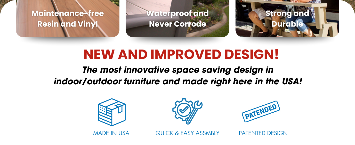 - Low maintenance: made from all-weather, maintenance-free resin and vinyl